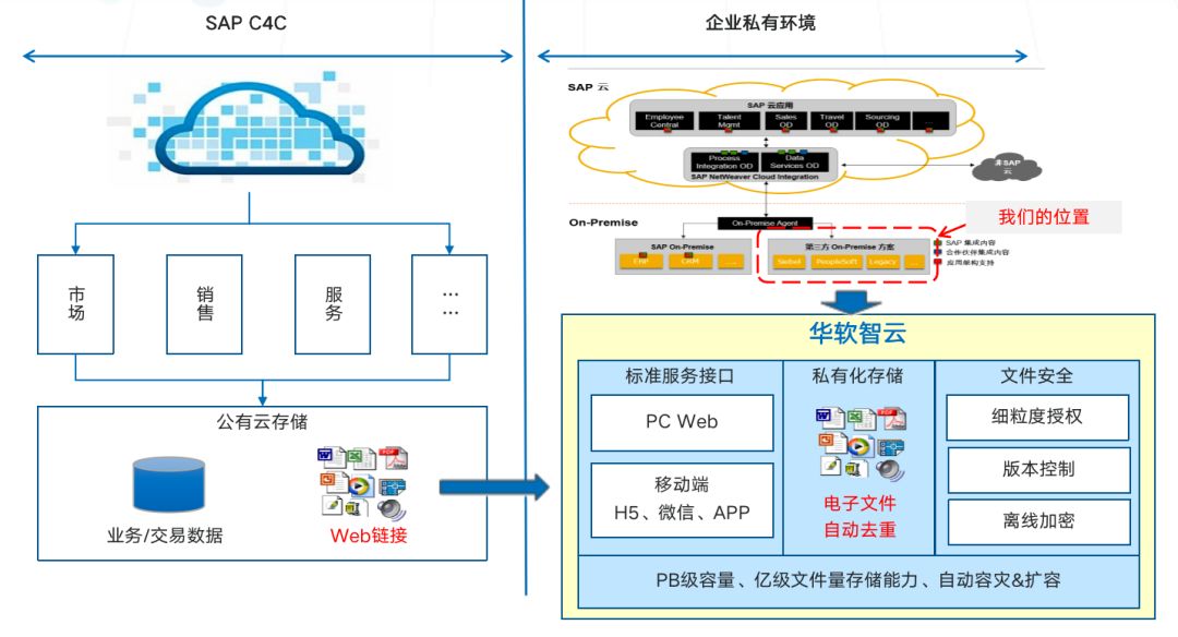 基于华软智云公有云服务接口快速和 SAP Cloud for Customer 集成,实现混合云服务让客户敏感文件和内容实现私有化安全管。